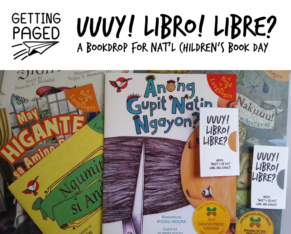 (1) Volunteer for bookdrops. GettingPaged has 5 sets of 5 PBBY-awarded storybooks* ready for 5 volunteers. We’re looking for 1 volunteer in non-Metro Manila Luzon, 2 in Visayas, and another 2 in Mindanao. (GettingPaged will be in Batanes in July, so that makes 2 for Luzon also.) For a chance to get a set, tell us where you are with a tweet to @GettingPaged using the hashtags #PBBY #BookDrop #NCBD . We will raffle off the sets & announce the winners on June 17 (two Tuesdays from now). We’ll increase the number of winners if we get more books. (See #2)