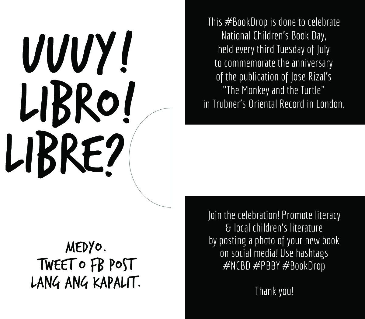 (3) Go solo! Choose from your favorite local kids’ books, drop one somewhere, and post about it on social media using the hashtags. Or, just help us promote Filipino children’s literature by greeting everyone a Happy National Children’s Book Day on July 17.